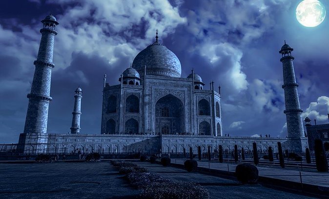 Under a full moon, the Taj Mahal can appear silvery-blue due to the way the moonlight is reflected.