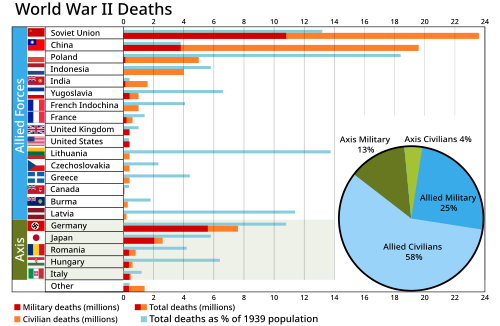 - Civilian vs. military deaths: The proportion of civilian casualties was extraordinarily high, with an estimated 50–55 million civilian deaths compared to 21–25 million military deaths. This shift in the nature of warfare was due to strategic bombing campaigns, widespread famine, and genocidal policies.